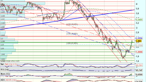 En el largo plazo, PHARMA MAR, tras una fuerte tendencia bajista, encontró suelo en los 1,23 euros, desde donde se impulsa, acelerando tendencia sucesivamente y con fuerza, superando resistencias y media de 200 sesiones tanto en diario como en semanal.