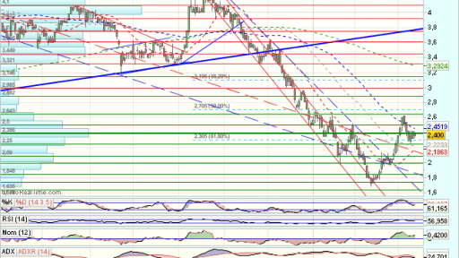 En el medio plazo, PHARMA MAR mantiene una consolidacion lateral en los 2,66, vuelve a encontrar apoyos en los 2,37 euros, para un nuevo impulso alcista que encuentra obstaculos en los 4,33 euros que fuerzan una consolidación.