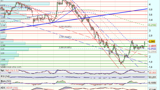 En el medio plazo, PHARMA MAR mantiene una consolidacion lateral en los 2,66, vuelve a encontrar apoyos en los 2,37 euros, para un nuevo impulso alcista que encuentra obstaculos en los 4,33 euros que fuerzan una consolidación.