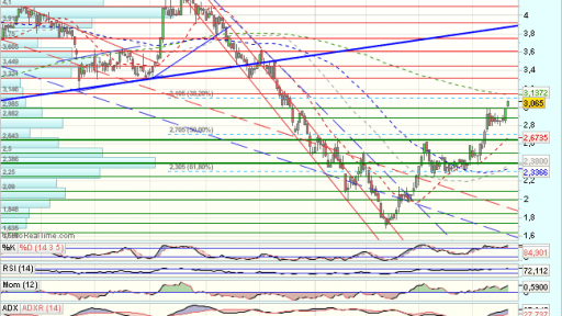 En el largo plazo, PHARMA MAR, tras una fuerte tendencia bajista, encontró suelo en los 1,23 euros, desde donde se impulsa, acelerando tendencia sucesivamente y con fuerza, superando resistencias y media de 200 sesiones tanto en diario como en semanal.