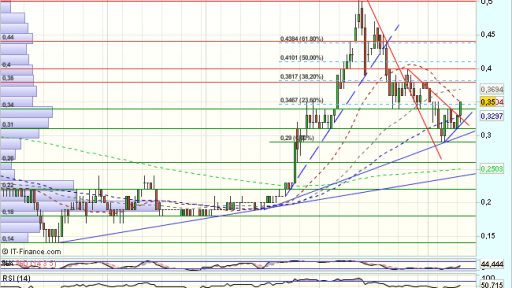 En el medio plazo acelera tendencia sucesivamente, hasta encontrar obstáculos en los 0,53 euros, que fuerzan una consolidación.