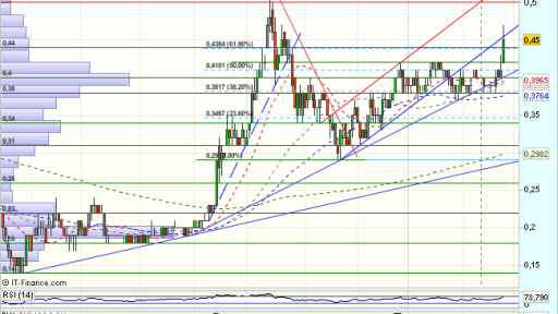 En el medio plazo acelera tendencia sucesivamente, hasta encontrar obstáculos en los 0,53 euros, que fuerzan una consolidación.
