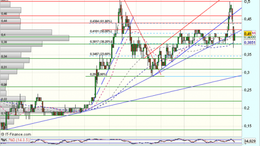 En el medio plazo acelera tendencia sucesivamente, hasta encontrar obstáculos en los 0,53 euros, que fuerzan una consolidación y encuentra apoyos en los 0,29 euros, para un nuevo impulso alcista, que supera el 61,8% de recuperacion de toda la caida previa.