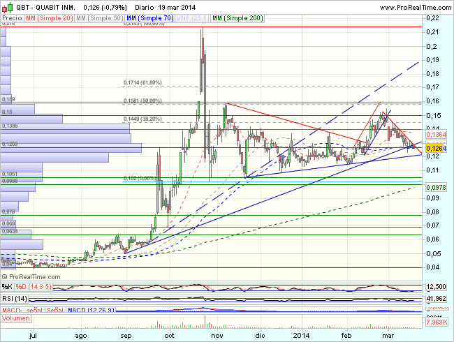 En el largo plazo, Quabit, mantiene una fuerte tendencia bajista, que encuentra suelo en los 0,04 euros, derivando en un prolongado movimiento lateral.