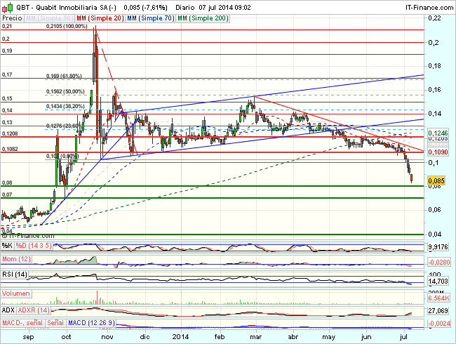 En el largo plazo, Quabit, mantiene una fuerte tendencia bajista, que encuentra suelo en los 0,04 euros, derivando en un prolongado movimiento lateral.