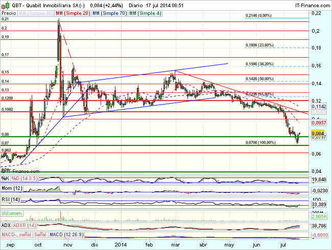 En el largo plazo, Quabit, mantiene una fuerte tendencia bajista, que encuentra suelo en los 0,04 euros, derivando en un prolongado movimiento lateral.