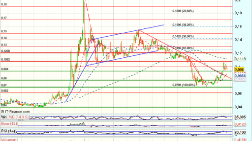 En el medio plazo, define el rango lateral como de agotamiento bajista, dando lugar a un fuerte impulso alcista, que supera la media de 200 sesiones, y encuentra obstáculos en los 0,21 euros, que fuerzan una consolidación.