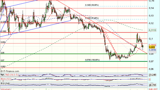 En el medio plazo, define el rango lateral como de agotamiento bajista, dando lugar a un fuerte impulso alcista, que supera la media de 200 sesiones, y encuentra obstáculos en los 0,21 euros, que fuerzan una consolidación.