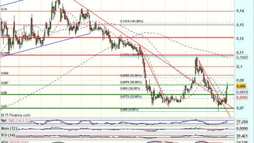 En el medio plazo, define el rango lateral como de agotamiento bajista, dando lugar a un fuerte impulso alcista, que supera la media de 200 sesiones, y encuentra obstáculos en los 0,21 euros, que fuerzan una consolidación.