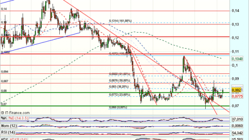 En las últimas sesiones, se apoya en el soporte de los 0,07, desde donde rebota, en un pullback a resistencias en 0,088 euros, que fuerzan un trhrowback a soportes en 0,076, desde donde rebota, con primeros objetivos en los……….Sigue en https://www.mercadosencontinuo.es/mapa
