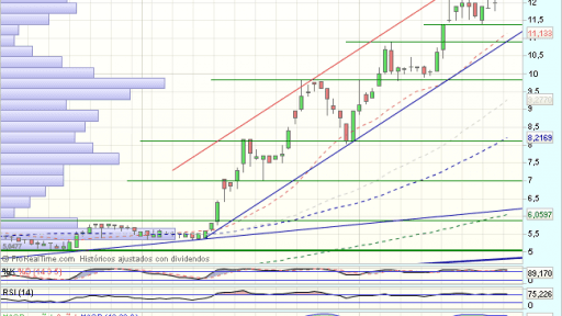 En el medio plazo, define el rango lateral como de agotamiento bajista, dando lugar a un fuerte impulso alcista, que supera la media de 200 sesiones, y encuentra obstáculos en los 0,21 euros, que fuerzan una consolidación.