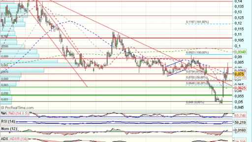 En el medio plazo, define el rango lateral como de agotamiento bajista, dando lugar a un fuerte impulso alcista, que supera la media de 200 sesiones, y encuentra obstáculos en los 0,15 euros, que fuerzan una consolidación.