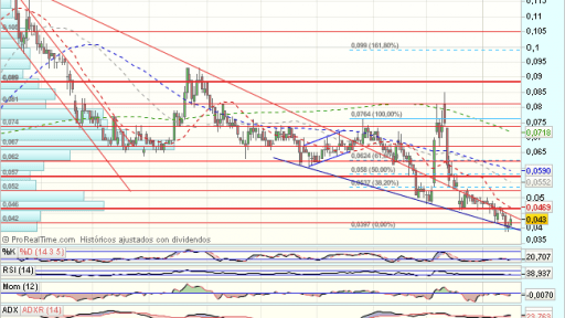 En el medio plazo, define el rango lateral como de agotamiento bajista, dando lugar a un fuerte impulso alcista, que supera la media de 200 sesiones, y encuentra obstáculos en los 0,15 euros, que fuerzan una consolidación.