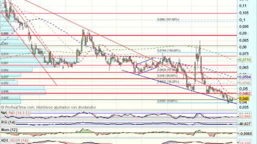 En el medio plazo, define el rango lateral como de agotamiento bajista, dando lugar a un fuerte impulso alcista, que supera la media de 200 sesiones, y encuentra obstáculos en los 0,15 euros, que fuerzan una consolidación.