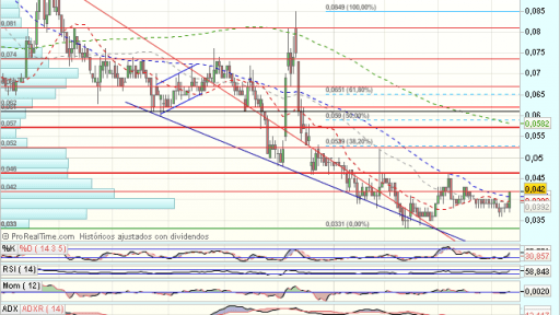 En el medio plazo, define el rango lateral como de agotamiento bajista, dando lugar a un fuerte impulso alcista, que supera la media de 200 sesiones, y encuentra obstáculos en los 0,15 euros, que fuerzan una consolidación.
