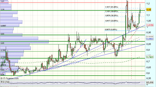 En el corto plazo, se impulsa con fuerza, hasta los 1,28 que fuerzan una consolidacion a la directriz alcista, desde donde rebota, superando el 61,8% de recuperacion del impulso bajista previo, con primeros objetivos en los……….Sigue