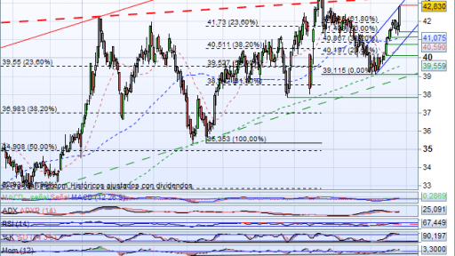 REE,se encontraba en la sesión de ayer, bajo fuerte presión compradora cerrando finalmente con una importante vela verde en los 42,83 euros con unas ganancias del 2,60%.