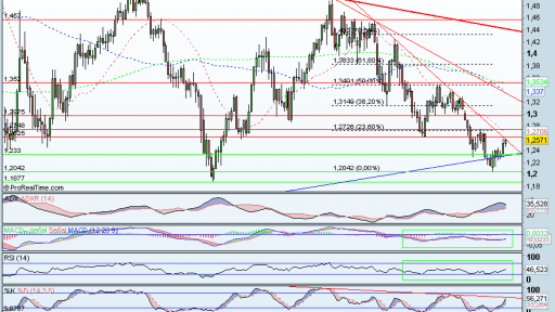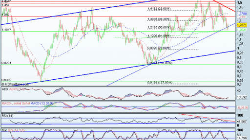 En el muy largo plazo, con gráfico mensual, la tendencia de fondo de la relación eur/usd es alcista y está marcada por la línea de tendencia azul que une los mínimos de 1985 (dato que corresponde en realidad a la relación entre el marco alemán y el dólar) y los mínimos del 2000 y 2001. Si trazamos de forma paralela a dicha línea de tendencia otra que una los máximos, se puede ver cierta formación de un canal alcista de muy largo plazo. El último impulso alcista de largo recorrido comenzó en el 2001 y nos llevó hasta los máximos históricos de julio de 2008 en los 1,6038. A partir de ese momento ha comenzado un movimiento de consolidación de las anteriores subidas con gran volatilidad que no ha sido capaz de romper a la baja el 50% del retroceso de Fibonacci, nivel que supone un fuerte soporte para las cotizaciones entorno a los 1,2125. En dos ocasiones, junio de 2010 y julio 2012, las cotizaciones han probado la solidez de ese nivel. Sin embargo, en las dos ocasiones los impulsos bajistas se han detenido en la media de 200, desde la que han rebotado al alza, señalando dichas rupturas a la baja del 50% de Fibonacci como trampas de mercado. En el proceso de consolidación se puede destacar una tendencia bajista señalada con una línea de tendencia roja. Cabe señalar también la presencia de una línea de tendencia alcista acelerada que une los mínimos de julio de 2001 y los de febrero de 2002. Dicha línea de tendencia fue rota a la baja el mes pasado, pero el cierre de la vela mensual se hizo precisamente en los niveles de dicha línea de tendencia y en el presente mes, si bien ha vuelto a testearse, las cotizaciones parece que acabarán por encima de dicha línea de tendencia. Si atendemos a los indicadores, observamos que las medias móviles apoyan una tendencia alcista a muy largo plazo y, de hecho, la media de 200 funciona como importante soporte. Sin embargo en el medio y corto plazo de gráfica mensual, la tendencia es bajista, estando las cotizaciones muy por debajo de dichas medias y la media de corto plazo por debajo de la de medio. El ADX en el nivel de 18,59 marca la ausencia de tendencia definida, mostrando que estamos ante un período de consolidación. Cabe destacar que, sin embargo, el ADX comienza a orientarse al alza. El MACD es negativo y se encuentra bajo su línea de señal mostrando cierta debilidad de las cotizaciones. El RSI en los 41,96 señala cierto dominio de los bajistas, pero de forma moderada. Se puede observar que la línea de tendencia alcista que acompaña al RSI desde los mínimos de 1985 y la de tendencia bajista que comienza en los máximos de 2008 están muy cerca. Próximamente las cotizaciones tendrán que enfrentarse a la ruptura de una de estas dos tendencias, siendo en principio más sólida la de mayor plazo. El estocástico marca fuerte sobreventa en los 14,79 mostrando que los precios están débiles y bajistas. Sin embargo, dicho indicador está próximo a ofrecer una señal de compra ya que muestra cierta inclinación alcista que se aproxima a cruzar al alza su línea de señal, hecho que muestra que nos encontramos en una zona importante de soporte y que podría producirse un rebote próximamente. El Momentum es negativo, pero muestra señales de estar haciendo un mínimo desde el cual recuperarse de modo que, si bien señala debilidad en las cotizaciones, conviene estar atentos ante posibles rebotes. En resumen, a muy largo plazo la estructura técnica del eur/usd es la de encontrarse un proceso de consolidación dentro de una tendencia alcista. Dicha consolidación se caracteriza por una fuerte volatilidad y cierta tendencia bajista no muy fuerte. Dicha tendencia se frena en el soporte comprendido por el 50% del retroceso de Fibonacci y la media de 200 sesiones. Sólo si consigue romper a la baja dicha área, las cotizaciones irían a buscar el 61,8 % y el 78,6 % de retroceso que coinciden con soportes importantes. En principio parece que el soporte resiste y que puede producirse cierto rebote próximamente. A medio plazo, con gráficos semanales, el gráfico muestra con claridad que nos encontramos en un punto crucial entre resistencias y soportes. Como vemos, en la presente semana se está poniendo a prueba la resistencia de una línea de tendencia bajista que une los máximos de agosto y octubre de 2011, y de abril de 2012. La tendencia del valor a medio plazo es claramente bajista desde mediados del 2011. Las cotizaciones están en un punto de inflexión muy importante. Por una parte, en el área en torno a los 1,2125 hay un gran soporte en torno al 50% del retroceso de Fibonacci de las subidas desde 2001, tal y como hemos visto en el análisis a muy largo plazo, y que ocupa la zona entre los 1,1877 y los 1,233. Si dicho soporte se rompiese a la baja, las cotizaciones irían a buscar el 61,8 % del retroceso en el entorno de los 1,12, y si siguiese a la baja, irían a buscar la base del canal alcista de muy largo plazo en el entorno de la paridad, coincidente con el 78,6 % del retroceso. Por el otro lado, justo esta semana, el eur/usd está poniendo a prueba la línea de tendencia bajista que comentábamos anteriormente al principio del análisis a medio plazo. Dicha línea de tendencia se encuentra además muy cerca de la resistencia marcada por los mínimos de enero de este año en los 1,2625, que coinciden prácticamente con los mínimos de agosto del 2010. Resulta por tanto crucial el cierre de la vela que se corresponde a la presente semana, ya que nos puede ofrecer mucha información sobre si los alcistas tienen suficiente fuerza para continuar las subidas y neutralizar la línea de tendencia bajista que conduce las cotizaciones desde hace un año, o si continuamos con la tendencia bajista intacta y nos dirigimos, por tanto, a testear de nuevo los soportes anteriormente comentados. En caso de que los precios rompiesen al alza, tenemos muchas resistencias cercanas. La primera serían los 1,2748 que corresponde 