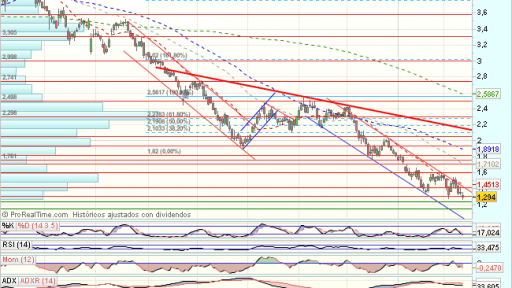 En el medio plazo, el impulso alcista, encuentra obstáculos en los 5,35 euros, que fuerzan un trhrowback a soportes en 2,65 euros, desde donde rebota en un pullback a resistencias en 4,25, que fuerzan una consolidación.