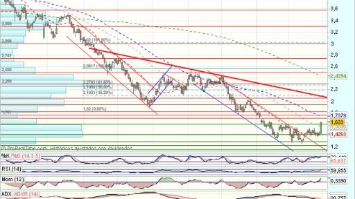 En el medio plazo, el impulso alcista, encuentra obstáculos en los 5,35 euros, que fuerzan un trhrowback a soportes en 2,65 euros, desde donde rebota en un pullback a resistencias en 4,25, que fuerzan una consolidación.