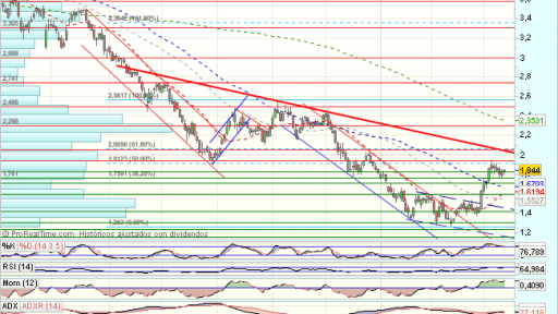 En el medio plazo, el impulso alcista, encuentra obstáculos en los 5,35 euros, que fuerzan un trhrowback a soportes en 2,65 euros, desde donde rebota en un pullback a resistencias en 4,25, que fuerzan una consolidación.
