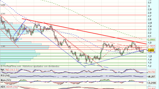 En el medio plazo, el impulso alcista, encuentra obstáculos en los 5,35 euros, que fuerzan un trhrowback a soportes en 2,65 euros, desde donde rebota en un pullback a resistencias en 4,25, que fuerzan una consolidación.