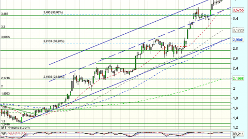Sacyr Vallehermoso, se encuentra bajo presión compradora en la sesión de hoy confirmando la superación de la resistencia en los 3,6 euros, y cotiza durante la sesión con beneficios del 1,97% hasta los 3,8380 euros.