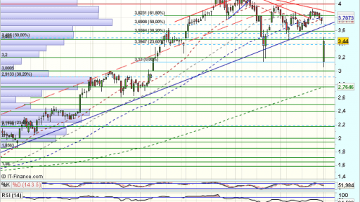 En el corto plazo, encuentra obstáculos en los 4,25 euros, que fuerzan una consolidación, que deriva en una formacion triangular, cuya directriz techo rechaza el impulso, en un nuevo impulso bajista, que rompe la base con fuerza y gap bajista, y primeros objetivos en los ……….Sigue https://www.mercadosencontinuo.es/sacyr-analisis-tecnico-34