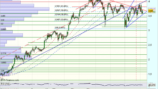 En el corto plazo, encuentra obstáculos en los 4,28 euros, que fuerzan una consolidación hasta los 3,06 euros , desde donde rebota, superando el 61,8% de todo el impulso bajista previo, con primeros objetivos en los ……….Sigue