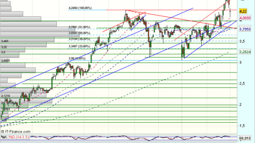 En el medio plazo, el impulso alcista, supera con fuerza el 61,8% de recuperación de todo el impulso bajista previo desde los 6 euros y encuentra obstáculos en los 4,28 euros, que fuerzan una consolidación hasta los 3,06 euros , desde donde inicia un nuevo impulso alcista.