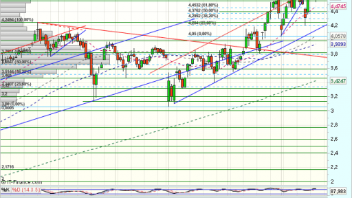 En el medio plazo, el impulso alcista, supera con fuerza el 61,8% de recuperación de todo el impulso bajista previo desde los 6 euros y encuentra obstáculos en los 4,28 euros, que fuerzan una consolidación hasta los 3,06 euros , desde donde inicia un nuevo impulso alcista.