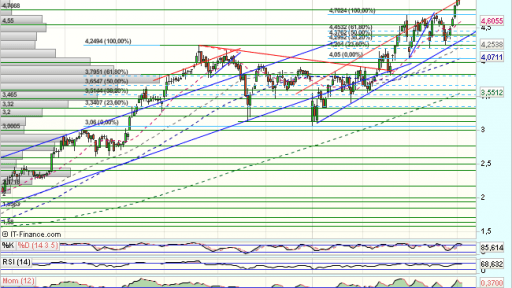 En el corto plazo, encuentra obstaculos en el techo del canal alcista, que fuerzan un throwback a soportes en los 4,2, desde donde rebota superando el 100% de recuperacion, con primeros objetivos en los ……….Sigue en https://www.mercadosencontinuo.es/mapa