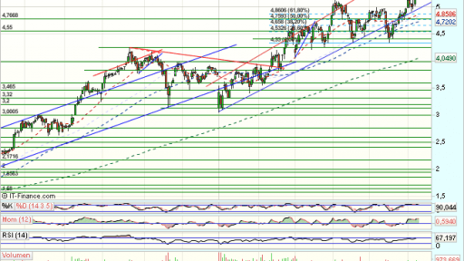 En el medio plazo, el impulso alcista, supera con fuerza el 61,8% de recuperación de todo el impulso bajista previo desde los 6 euros y encuentra obstáculos en los 4,28 euros, que fuerzan una consolidación hasta los 3,06 euros , desde donde inicia un nuevo impulso alcista.