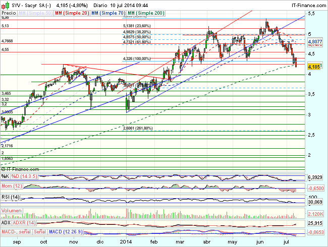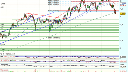 En el medio plazo, el impulso alcista, supera con fuerza el 61,8% de recuperación de todo el impulso bajista previo desde los 6 euros y encuentra obstáculos en los 4,28 euros, que fuerzan una consolidación hasta los 3,06 euros , desde donde inicia un nuevo impulso alcista.