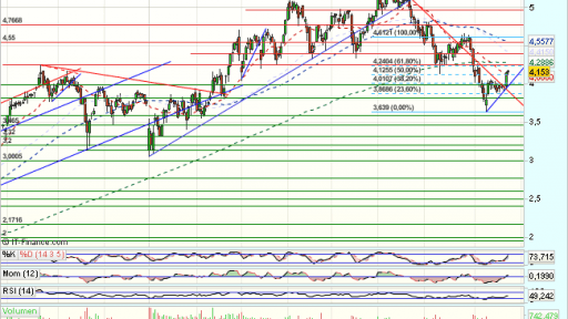 En el medio plazo, el impulso alcista, supera con fuerza el 61,8% de recuperación de todo el impulso bajista previo desde los 6 euros y encuentra obstáculos en los 4,28 euros, que fuerzan una consolidación hasta los 3,06 euros , desde donde inicia un nuevo impulso alcista.