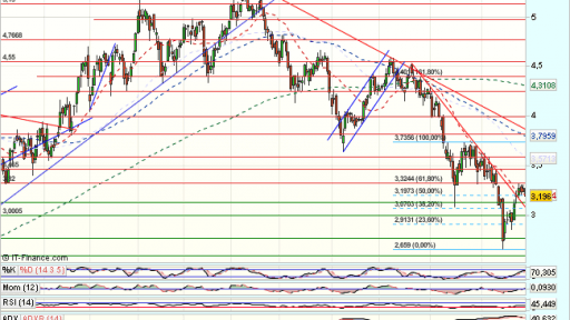 En el medio plazo, el impulso alcista, supera con fuerza el 61,8% de recuperación de todo el impulso bajista previo desde los 6 euros y encuentra obstáculos en los 4,28 euros, que fuerzan una consolidación hasta los 3,06 euros , desde donde inicia un nuevo impulso alcista.