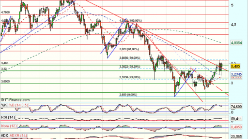 En el medio plazo, el impulso alcista, supera con fuerza el 61,8% de recuperación de todo el impulso bajista previo desde los 6 euros y encuentra obstáculos en los 5,35 euros, que fuerzan una consolidación.
