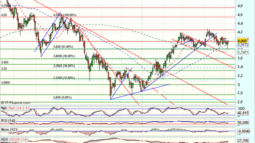 En el medio plazo, el impulso alcista, encuentra obstáculos en los 5,35 euros, que fuerzan un trhrowback a soportes en 2,65 euros, desde donde rebota.