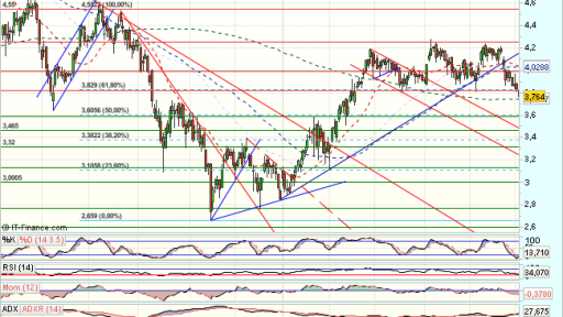 En el medio plazo, el impulso alcista, encuentra obstáculos en los 5,35 euros, que fuerzan un trhrowback a soportes en 2,65 euros, desde donde rebota.
