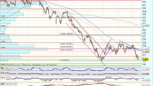 En el medio plazo, el impulso alcista, encuentra obstáculos en los 5,35 euros, que fuerzan un trhrowback a soportes en 2,65 euros, desde donde rebota en un pullback a resistencias en 4,25, que fuerzan una consolidación.