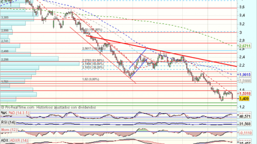 En el medio plazo, el impulso alcista, encuentra obstáculos en los 5,35 euros, que fuerzan un trhrowback a soportes en 2,65 euros, desde donde rebota en un pullback a resistencias en 4,25, que fuerzan una consolidación.