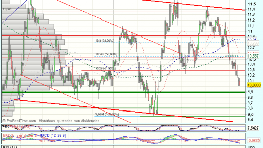 La tendencia de largo plazo de Telefónica es bajista, aunque en el medio plazo, tras encontrar apoyos en los 8 euros, define un movimiento lateral, con suelo en el soporte de los 9,9 euros y techo en los 11,6 euros.