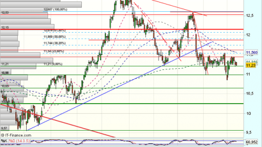 En el medio plazo, supera el techo del rango lateral, definiéndolo como de agotamiento bajista, en un impulso alcista que le lleva hasta encontrar obstáculos en los 12,77 euros, que fuerzan una consolidación, que perfora la directriz alcista y el 100% de retroceso del impulso alcista previo.