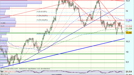 En el medio plazo, supera el techo del rango lateral, definiéndolo como de agotamiento bajista, en un impulso alcista que le lleva hasta encontrar obstáculos en los 12,77 euros, que fuerzan una consolidación, que perfora la directriz alcista y el 100% de retroceso del impulso alcista previo.