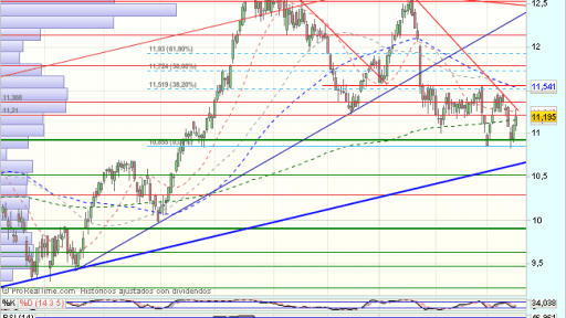 En el medio plazo, supera el techo del rango lateral, definiéndolo como de agotamiento bajista, en un impulso alcista que le lleva hasta encontrar obstáculos en los 12,77 euros, que fuerzan una consolidación, que perfora la directriz alcista y el 100% de retroceso del impulso alcista previo.