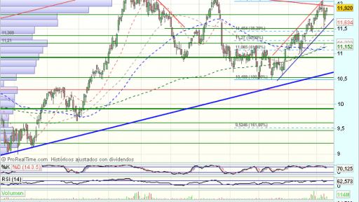 En el medio plazo, supera el techo del rango lateral, definiéndolo como de agotamiento bajista, en un impulso alcista que le lleva hasta encontrar obstáculos en los 12,77 euros, que fuerzan una consolidación a soportes en 11 euros.