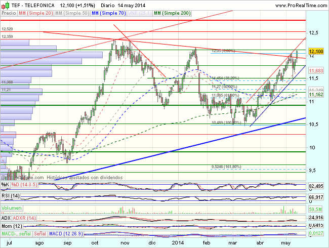 En el medio plazo, supera el techo del rango lateral, definiéndolo como de agotamiento bajista, en un impulso alcista que le lleva hasta encontrar obstáculos en los 12,77 euros, que fuerzan una consolidación a soportes en 11 euros.