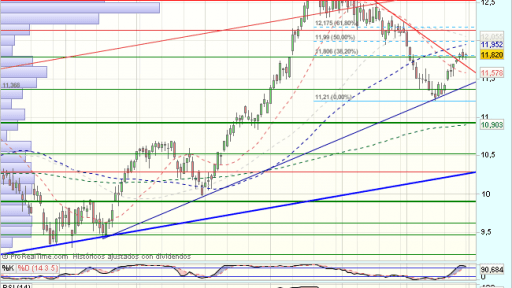 En el medio plazo, supera el techo del rango lateral, definiéndolo como de agotamiento bajista, en un impulso alcista que le lleva hasta encontrar obstáculos en los 12,77 euros.