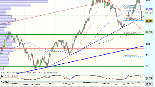 En el medio plazo, supera el techo del rango lateral, definiéndolo como de agotamiento bajista, en un impulso alcista que le lleva hasta encontrar obstáculos en los 12,77 euros.