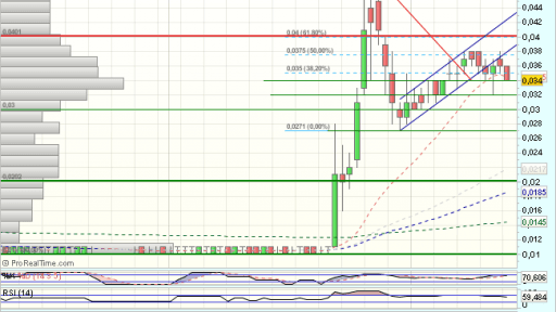 En el medio plazo, define el rango lateral como de agotamiento bajista, dando lugar a un fuerte impulso alcista, que supera la media de 200 sesiones, y encuentra obstáculos en los 0,05 euros, que fuerzan una consolidación